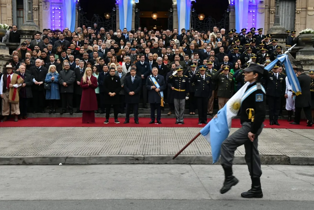 El gobernador Osvaldo Jaldo encabezó esta mañana el acto central por los 214 años de la Revolución de Mayo. Rodeado de su Gabinete en pleno, autoridades legislativas, municipales, comunales, de las fuerzas de seguridad, de la sociedad civil y por alumnos y docentes, dio un discurso de 10 minutos donde fue claro en su pedido de unidad en este día patrio