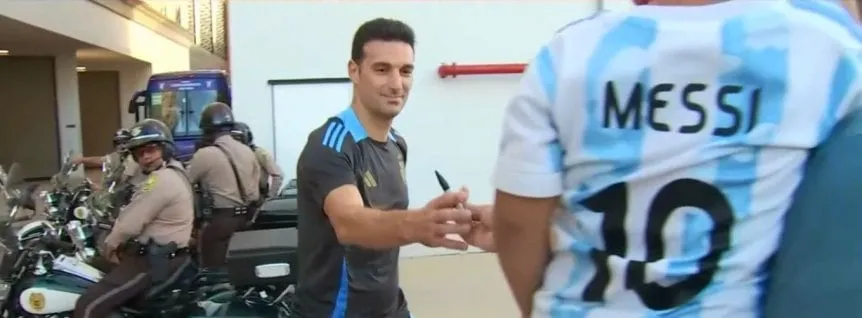 Una parte de la delegación de la Selección Argentina -sin Lionel Messi ni Dibu Martínez, entre otros futbolistas- deja Miami para regresar al país luego de la histórica consagración en la Copa América, con el agónico triunfo en tiempo extra en la final ante Colombia. Antes de partir al aeropuerto, Lionel Scaloni firmó camisetas de fanáticos que se acercaron a saludar al plantel.