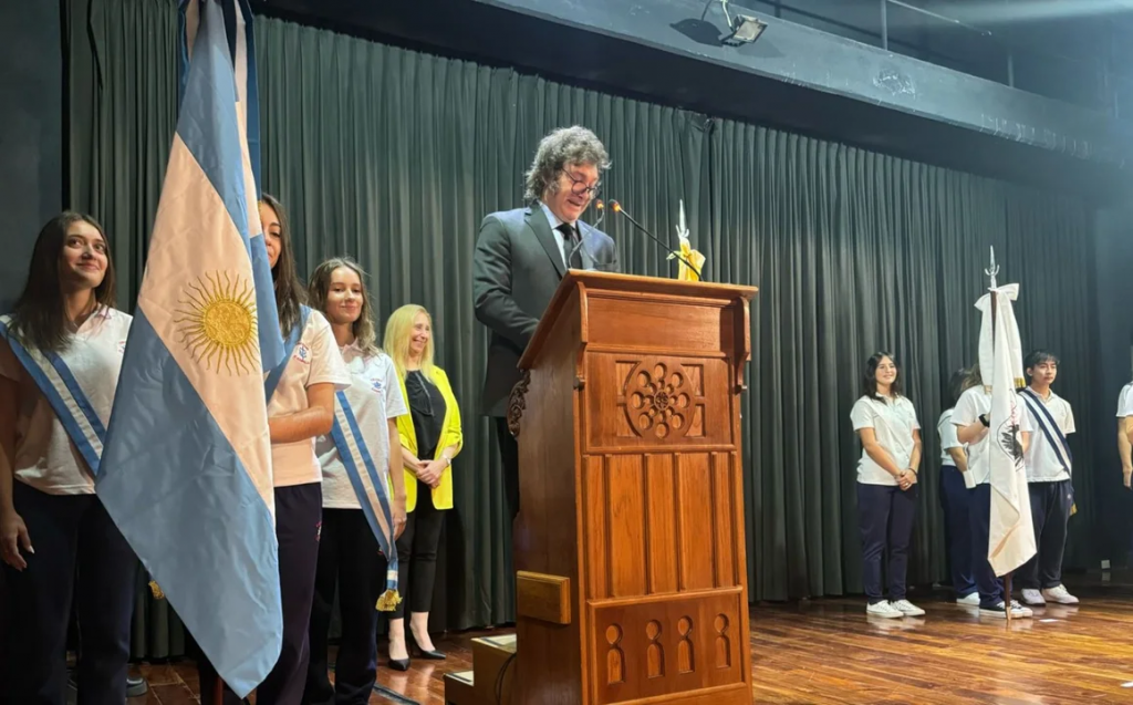 Milei inició su exposición recordando que su primer año en el colegio fue en 1977, un año después del inicio de la dictadura militar de 1976, y calificó esos años como “una de las partes más oscuras de la historia argentina”. Asimismo, le pidió a los alumnos presentes en el auditorio que lean “las dos partes de la biblioteca y tengan su propia mirada”, y admitió que en sus inicios se inclinó por una mirada “de izquierda”.
