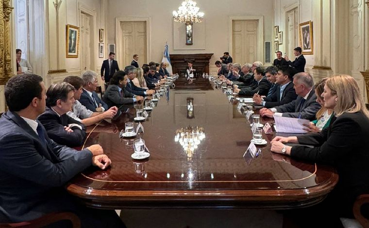 Además de Posse, que se ubicó en la cabecera de la mesa, la delegación oficial estaba integrada por el ministro Francos, el secretario de Hacienda, Carlos Guberman; el de Interior, Lisandro Catalán; y el secretario ejecutivo de Gobierno, José Rolandi, informaron fuentes oficiales. El encuentro se desarrollaba en el salón Eva Perón de la Casa Rosada.