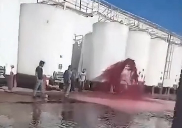 "Mirá que c... compadre, mirá todo el vino. Para los tomadores de vino, mira cómo corre, ha quedado todo morado el tanque, ya se chupó", se escucha la voz en off del autor del video, en el momento en que comienzan a desparramarse los 15 mil litros de vino tinto por el piso.