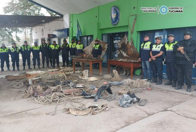 Dos escopetas, dos revólveres, más de 50 municiones de distinto calibre, y un rifle de aire comprimido. Además de estas armas, como pruebas del delito investigado, los policías incautaron cuatro motosierras y varios ganchos de hierro usados para la faena clandestina; sumados a decenas de cuchillos grandes y medianos, tipo carnicero; balanzas, sierras manuales, limas, cuero vacuno, machetes, lazos y monturas.